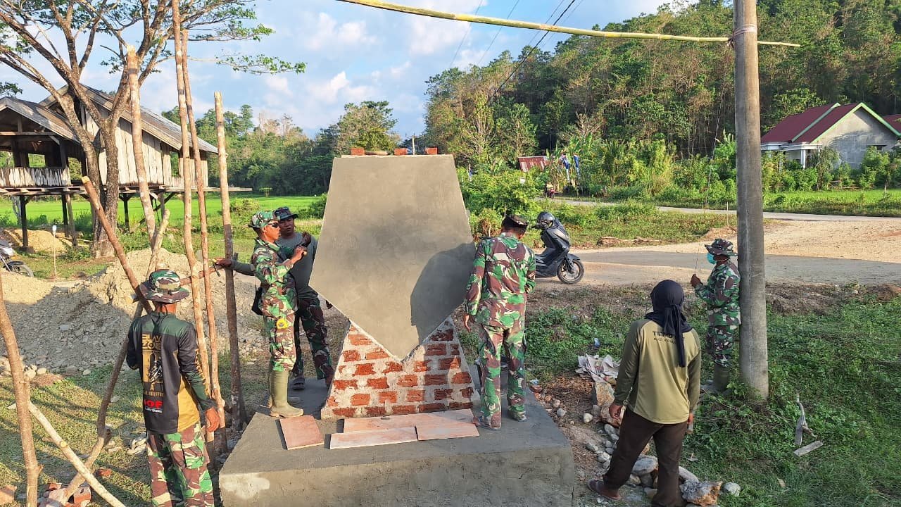 Konawe – Berkat keterampilan anggota Satgas TMMD Reguler ke-125 Kodim 1417/Kendari, pembangunan Tugu Prasasti TMMD di Desa Awua Jaya, Kecamatan Asinua, kini memasuki tahap plamir menggunakan bahan acian semen. Kamis (14/8/2025), tampak beberapa prajurit bergantian merapikan permukaan tugu agar siap untuk tahap pengecatan.