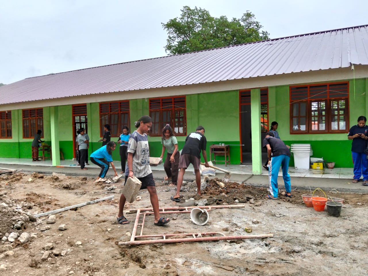 Kegiatan tersebut dilakukan sebagai bagian dari persiapan menjelang peresmian bangunan yang direncanakan berlangsung pada keesokan hari. Dengan penuh tanggung jawab, personel Satgas bersama para siswa mengangkut sisa material pembangunan serta memastikan tidak ada lagi bekas pekerjaan yang tertinggal.