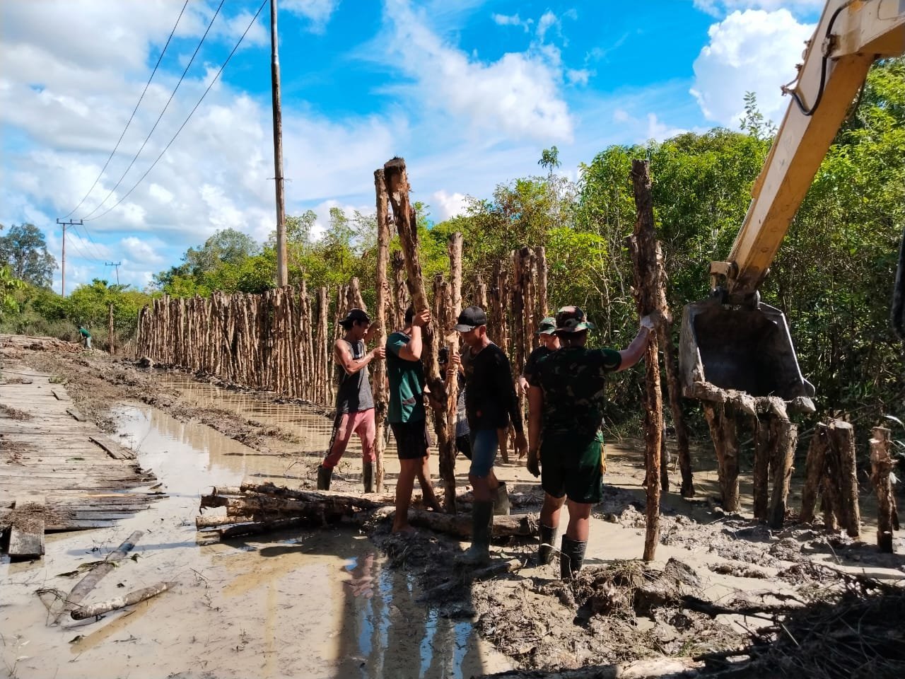 Meski kondisi medan berlumpur dan cukup menantang, warga tetap antusias bekerja bersama anggota TNI. Mereka memanggul dan menanamkan cerucuk dengan semangat tinggi demi kelancaran pembangunan jalan yang kelak akan mempermudah akses transportasi antar wilayah.