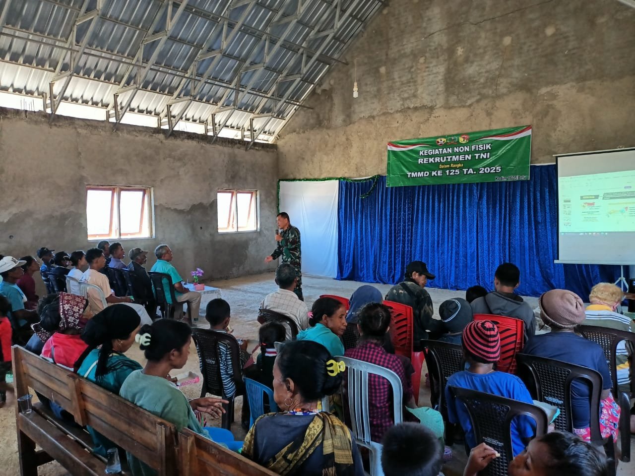 Belu, NTT – Satgas TNI Manunggal Membangun Desa (TMMD) ke-125 Tahun Anggaran 2025 Kodim 1605/Belu melaksanakan kegiatan penyuluhan rekrutmen TNI bagi warga Desa Naekasa, Kecamatan Tasifeto Barat, Kabupaten Belu, Senin (18/8/2025).