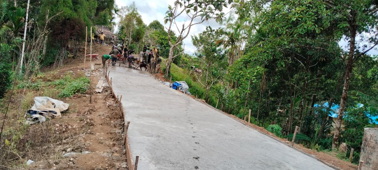 Kerja sama antara TNI dan warga berjalan harmonis. Mereka bahu-membahu menyiapkan adukan semen, mengangkut material, dan meratakan permukaan jalan demi terciptanya akses transportasi yang lebih baik bagi masyarakat.