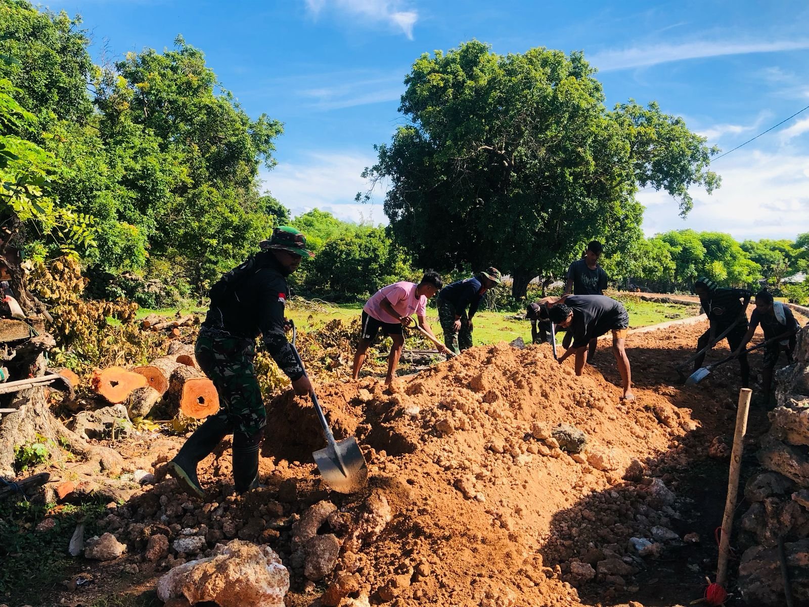Masyarakat bersama Satgas TMMD terlihat bekerja gotong royong meratakan tanah dengan menggunakan alat tradisional seadanya seperti gerobak dorong arco dan cangkul.