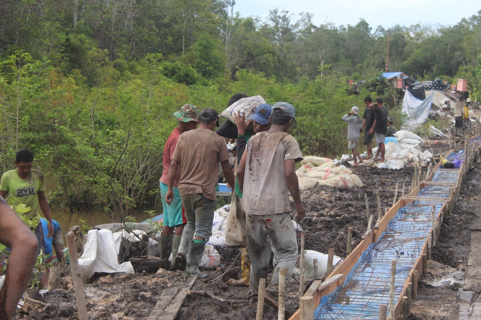 Meski pekerjaan berat dan medan sulit, warga bahu-membahu mengangkut dan mengaduk material dengan penuh antusiasme. Mereka tak kenal lelah agar pembangunan jalan segera rampung dan dapat dimanfaatkan oleh masyarakat luas.