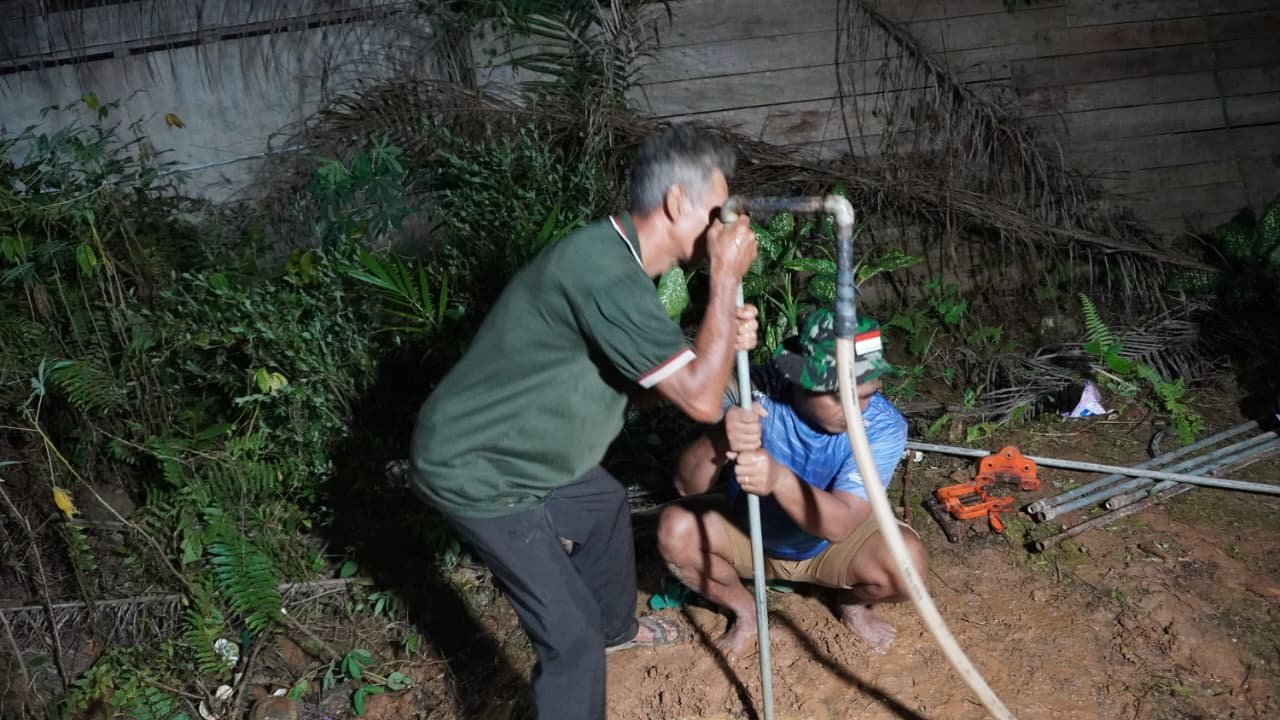 Pengerjaan sumur bor dilakukan oleh personel Satgas TMMD bersama warga secara gotong royong. Bahkan untuk mempercepat penyelesaian pekerjaan, proses pengeboran juga dilakukan hingga malam hari.