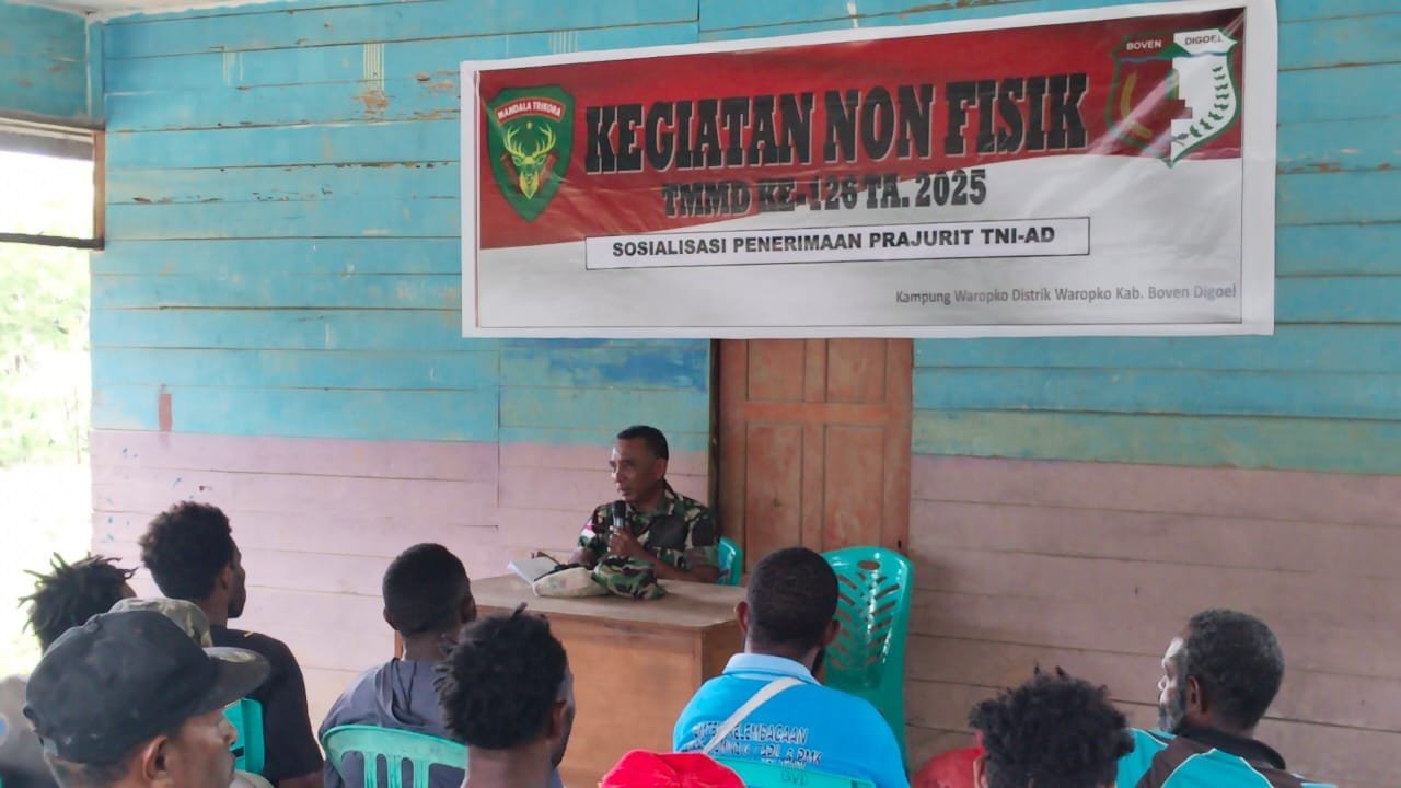Boven Digoel – Antusiasme masyarakat Kampung Waropko, Distrik Waropko, tampak tinggi saat mengikuti kegiatan penyuluhan penerimaan prajurit TNI AD yang digelar oleh Satgas TMMD ke-126 Kodim 1711/Boven Digoel, Kamis (23/10/2025).