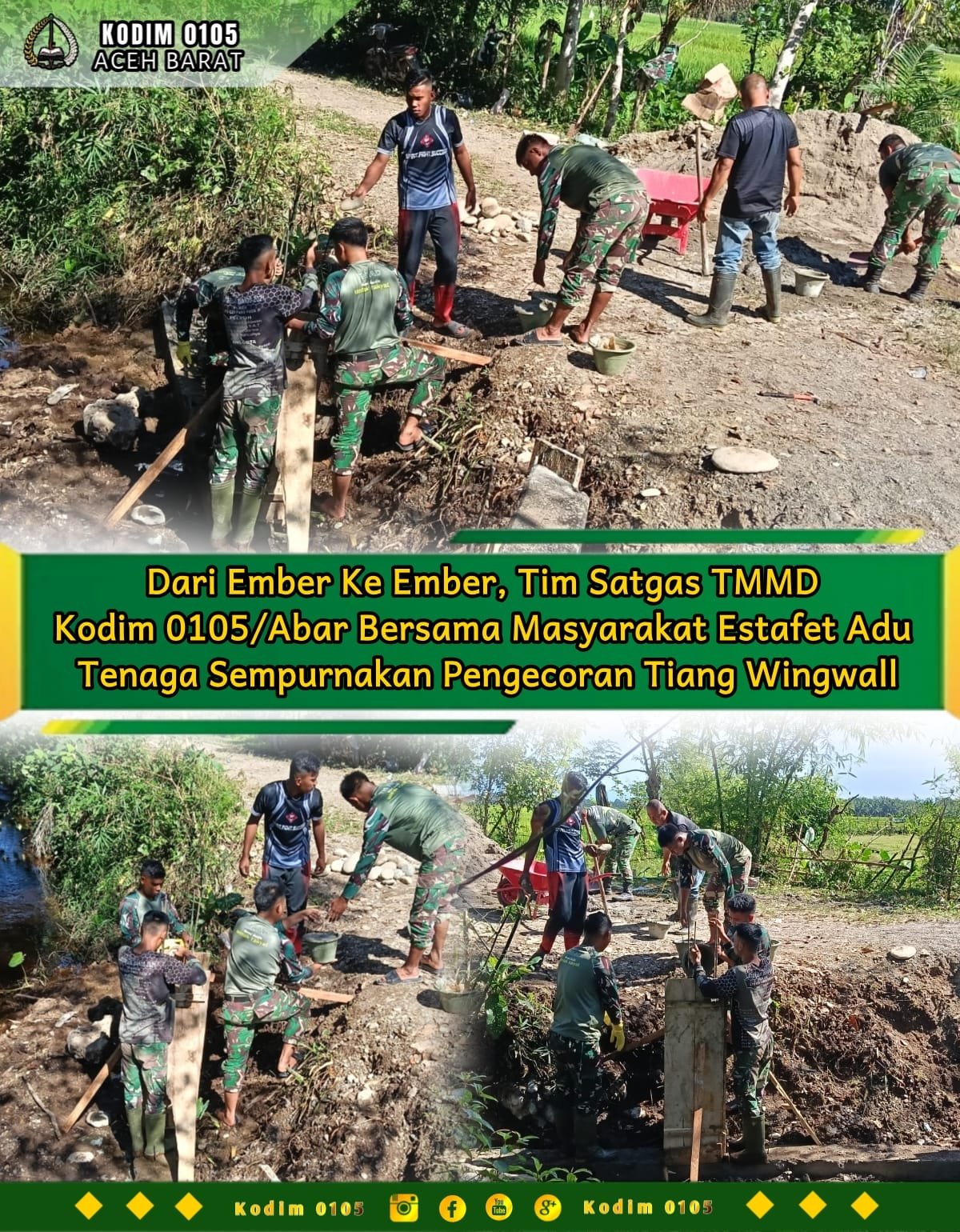 ACEH BARAT – Tahapan penting pembangunan infrastruktur dalam program TMMD Reguler ke-127 Kodim 0105/Abar kembali menunjukkan progres signifikan. Pengecoran tiang wingwall di Desa Pasi Aceh dilaksanakan secara manual dengan sistem estafet.