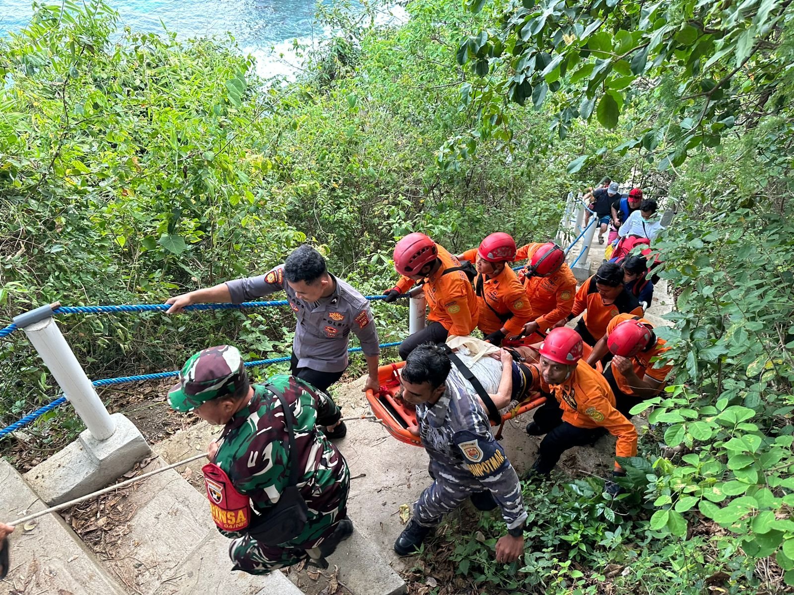 Klungkung,- Tim SAR gabungan yang terdiri dari Tim Rescue Unit Siaga SAR Nusa Penida, Tim Medis Klinik Nusa Medika, Koramil, Pos AL dan Polsek Nusa Penida melaksanakan evakuasi Warga Negara Asing ( WNA) yang tergelincir di Obyek Wisata Atuh Beach, Desa Pejukutan, Kec.amatan Nusa Penida., Selasa ( 28/10/25 ).