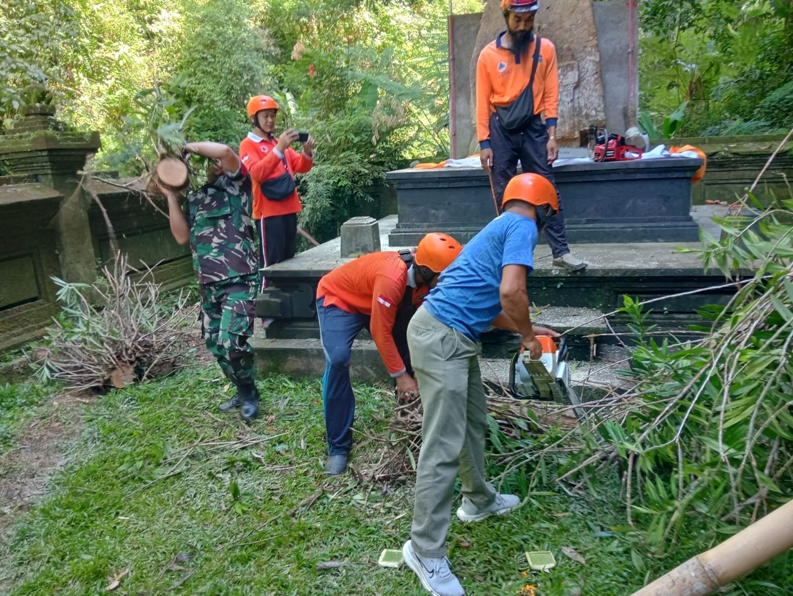 Bangli – Babinsa Desa Jehem Koramil 1626-03/Tembuku Kodim 1626/Bangli Sertu Kadek Muliana bersama BPBD Kabupaten Bangli dan masyarakat melaksanakan evakuasi pembersihan pohon tumbang yang menimpa Kawasan Cagar Budaya Candi Tebing Goa Rajo, Desa Jehem, Kecamatan Tembuku, Kabupaten Bangli. sabtu (05/04/2025)
