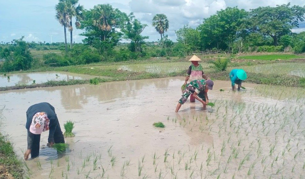 Dengan penuh rasa semangat Babinsa juga menumbuhkan semangat tinggi terhadap para petani dalam melakukan penanaman padi, bukan hanya saat panen padi saja tetapi juga di saat penyemaian bibit padi, pengolahan lahan sawah, perawatan sampai panen padi. Seperti saat ini yang sedang mereka lakukan ialah menanam padi di sawah, sebagai wujud rasa kepedulian terhadap para petani.