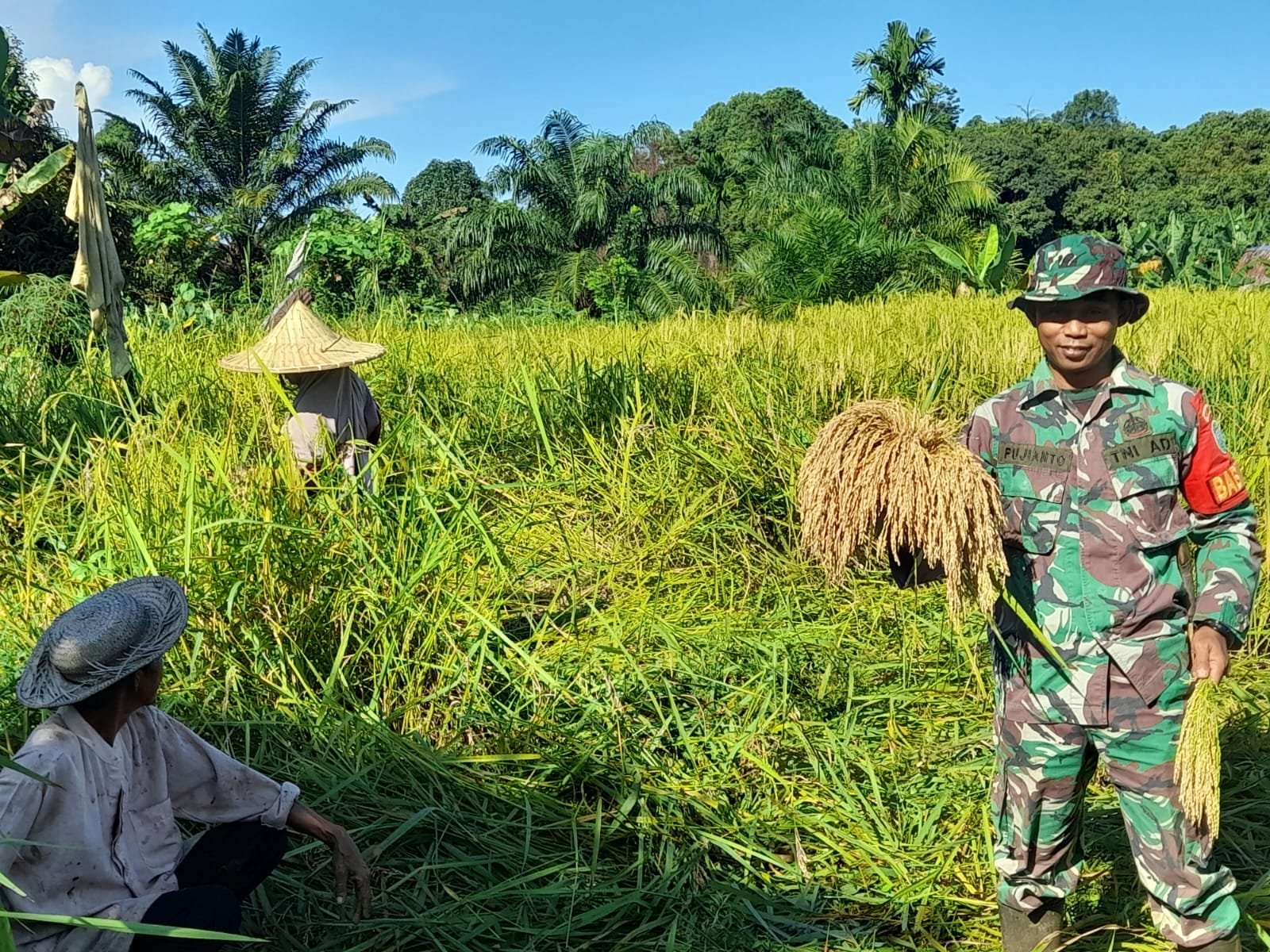 Dengan penuh rasa semangat, Babinsa juga menumbuhkan semangat tinggi terhadap para petani dalam melakukan panen padi, bukan hanya saat panen padi saja tetapi juga di saat penyemaian bibit padi, pengolahan lahan sawah, perawatan sampai panen padi. Seperti saat ini yang sedang melaksanakan panen padi, sebagai wujud rasa kepedulian terhadap para petani.