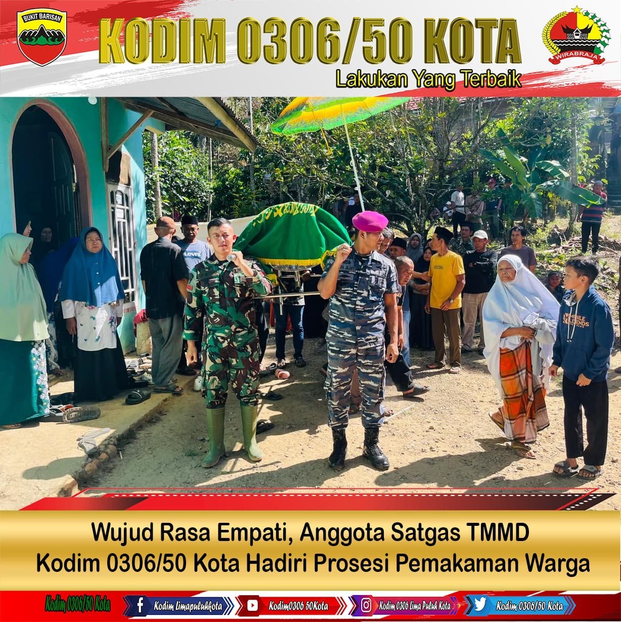 Lima Puluh Kota — Wujud Rasa Empati atas meninggalnya salah seorang warga, personel Satgas TMMD ke-124 Kodim 0306/50 Kota merespon cepat dengan turun angsung melakukan aksi sosial dengan membantu prosesi pemakaman, bertempat di Nagari Harau Kecamatan Harau Kabupaten 50 Kota. Sabtu (17/5/2025).