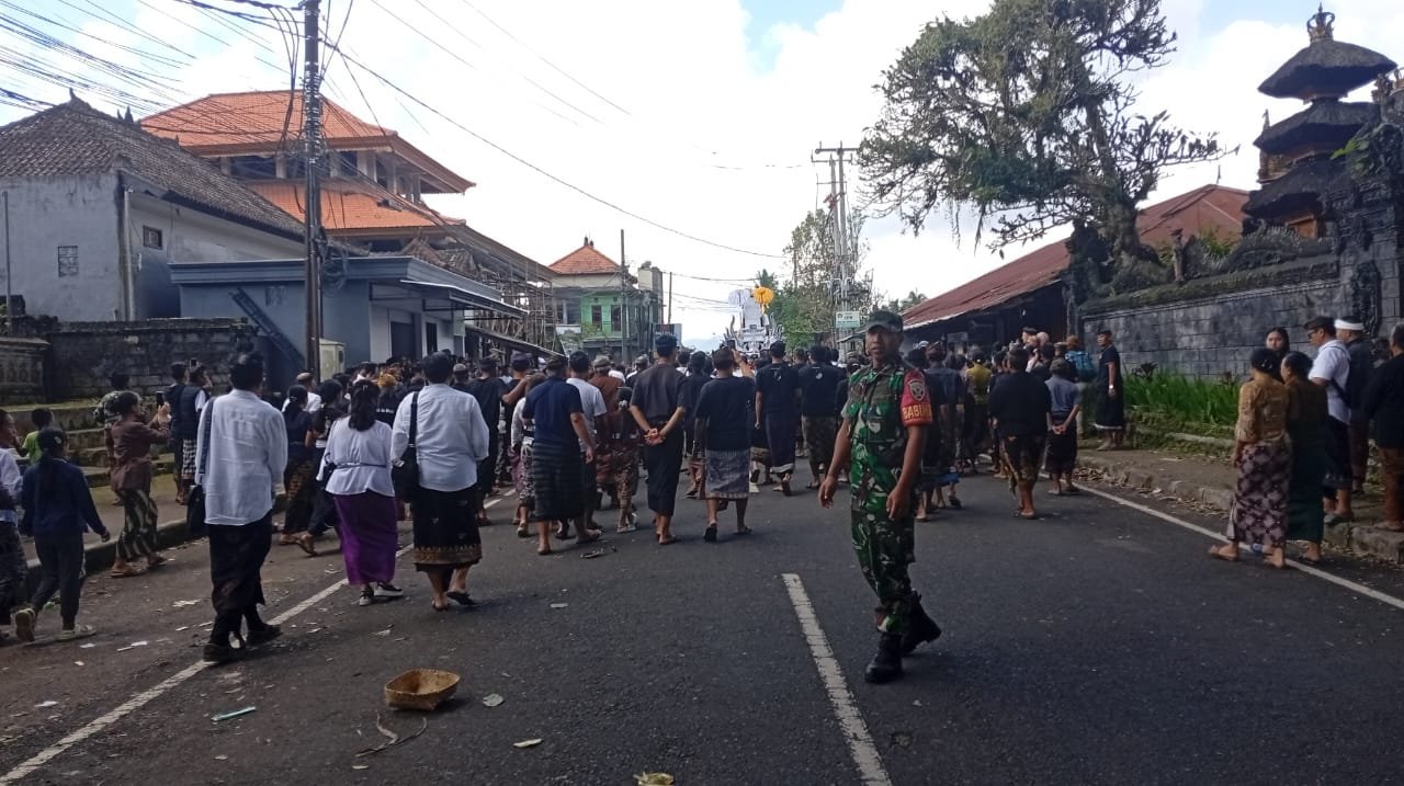 Bangli – Dalam rangka menciptakan situasi aman dan kondusif di wilayah binaan dalam rangka kegiatan adat Babinsa Undisan Koramil 1626-03/Tembuku Serda I Wayan Budiarta bersama Bhabinkamtibmas dan Pecalang melaksanakan Pemantauan dan pengamanan prosesi upacara Pitra Yadnya (Ngaben) Almarhum I Made Wijasa bertempat di Banjar Undisan Kelod Desa Undisan, Kecamatan Tembuku.selasa (08/07/25)