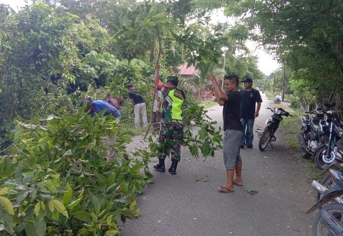 Nagan Raya – Guna menumbuhkan semangat gotong royong dan kepedulian masyarakat terhadap kebersihan lingkungan sekitarnya, Babinsa Koramil 01/Kuala, Serma Zulfikar, bersama masyarakat melaksanakan kegiatan gotong royong pembersihan ruas kanan-kiri jalan di Desa Blang Bintang, Kecamatan Kuala, Kabupaten Nagan Raya, Rabu (08/10/2025).